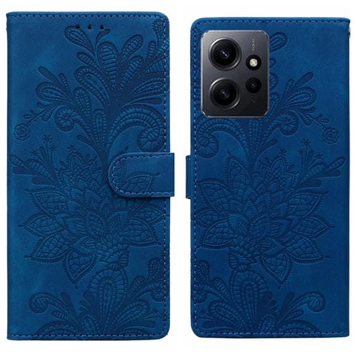 Funda de Teléfono con Hebilla Magnética de Pu con Encaje Floral En Relieve para Redmi Note 12 4G Global con Correa para la Muñeca (Azul)