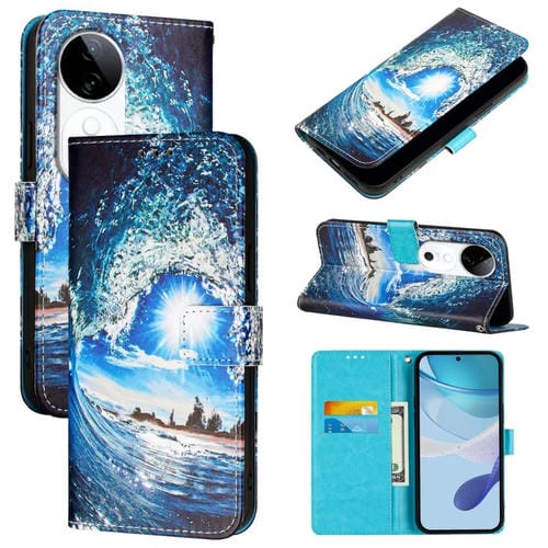 Funda de Teléfono de Cuero con Tejido Liso y Estampado de Dibujos En Colores para Vivo S19 (Ondas y Sol)
