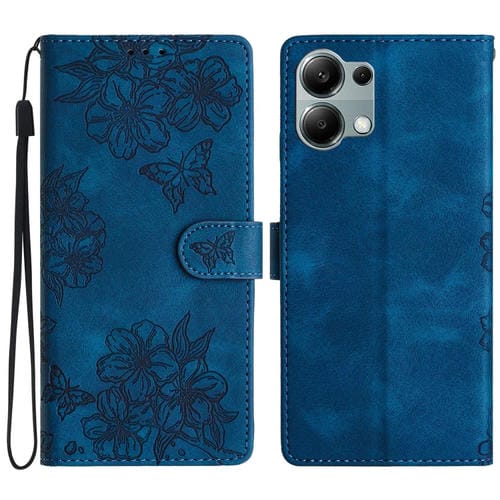 Funda de Teléfono de Pu con Relieve de Piel de Mariposa y Diseño de Flor de Cerezo para Redmi Note 13 Pro 4G (Azul)