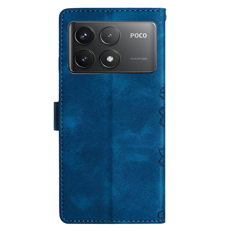 Funda de Teléfono de Pu con Relieve de Piel de Mariposa y Diseño de Flor de Cerezo para Xiaomi Poco F6 Pro (Azul)