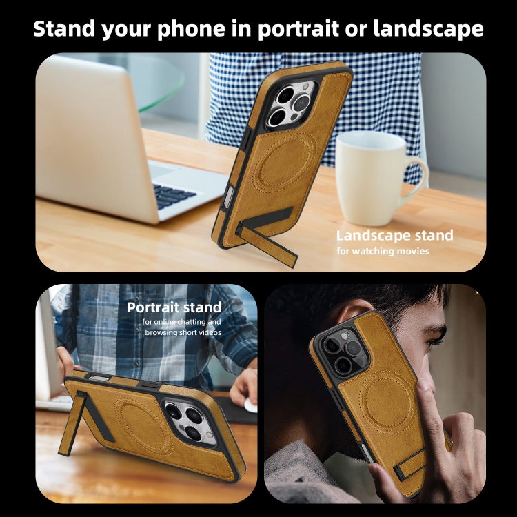Funda de teléfono PU Magsafe con soporte multifunción para iPhone 16 (Marrón)