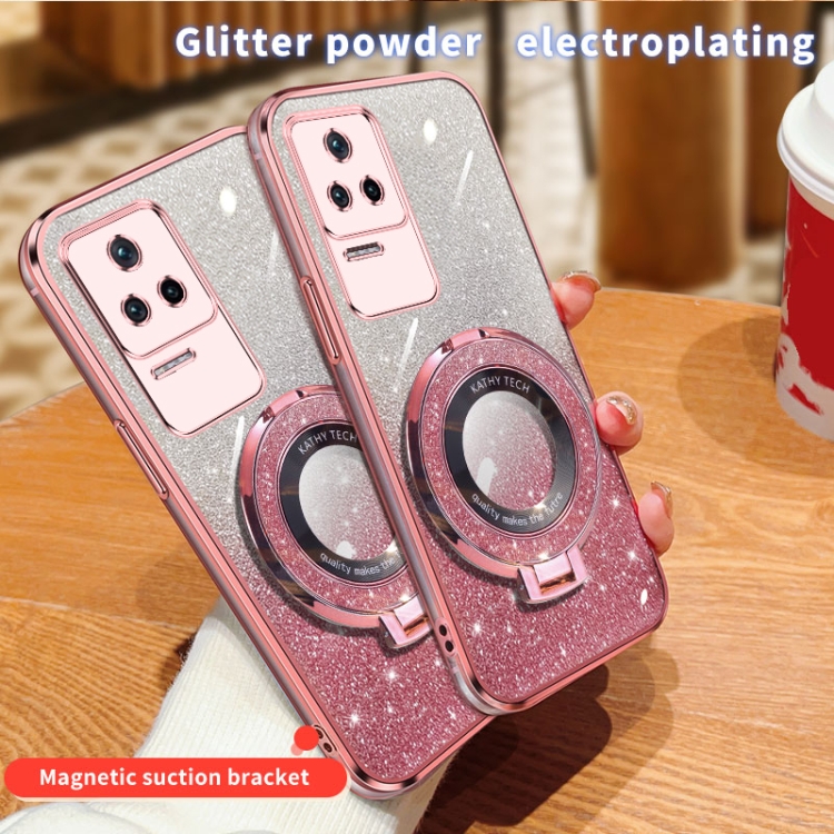Funda de Teléfono de TPU con Soporte Redondo y Purpurina Degradada Plateada para Redmi K40S (Rosa)