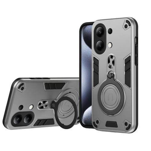 Funda de Teléfono Híbrida de TPU y PC con Soporte Giratorio de 360 Grados y Anillo de Metal para Redmi Note 13 4G (Gris Plateado)