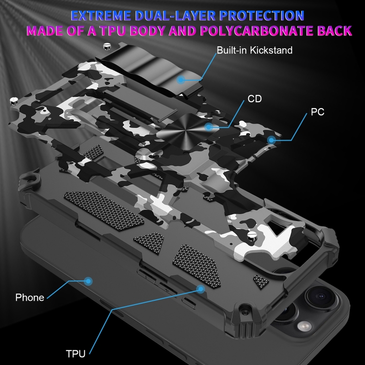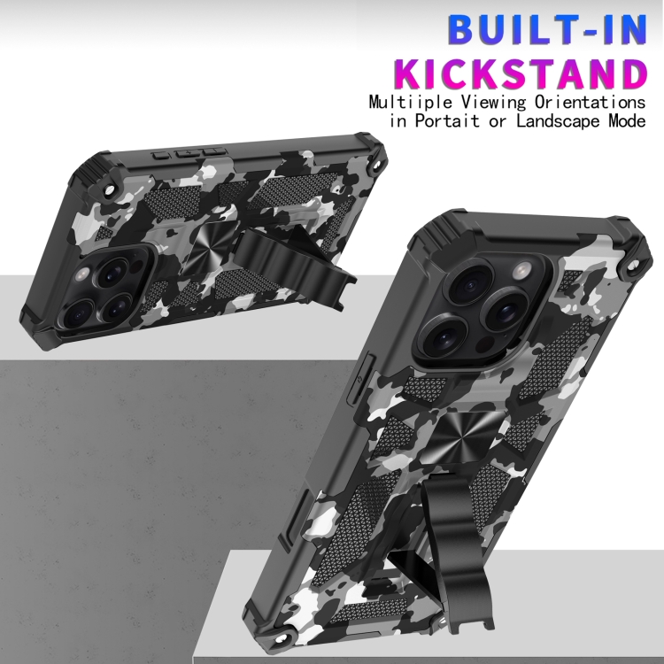 Funda híbrida TPU y PC para iPhone 16 Pro Max con soporte magnético camuflaje (Negro)