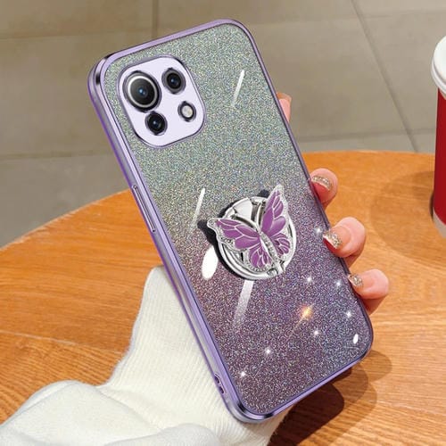 Funda de TPU con Soporte para Mariposa con Purpurina Degradada Plateada para Xiaomi Mi 11 Lite (Morado)