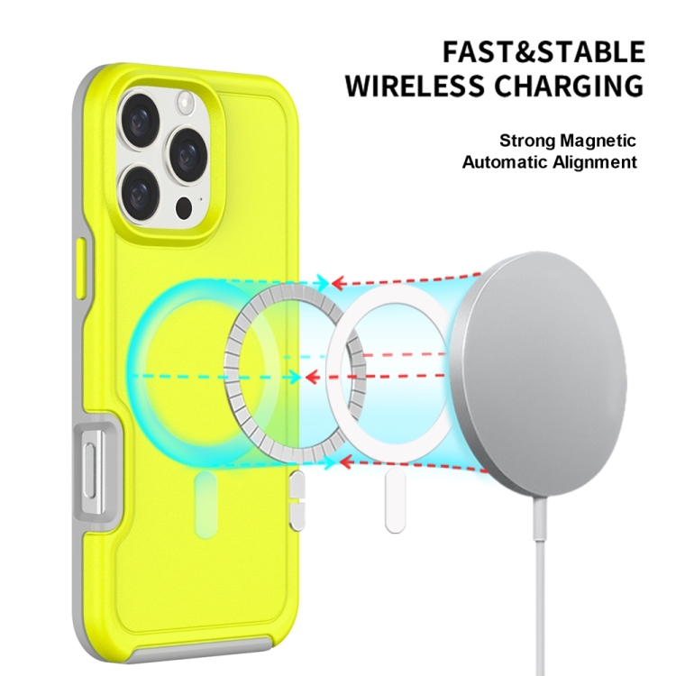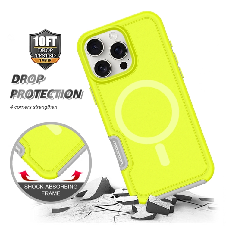 Funda híbrida TPU y PC para iPhone 16 Plus con protección Magsafe a prueba de golpes (Verde fluorescente y Gris)