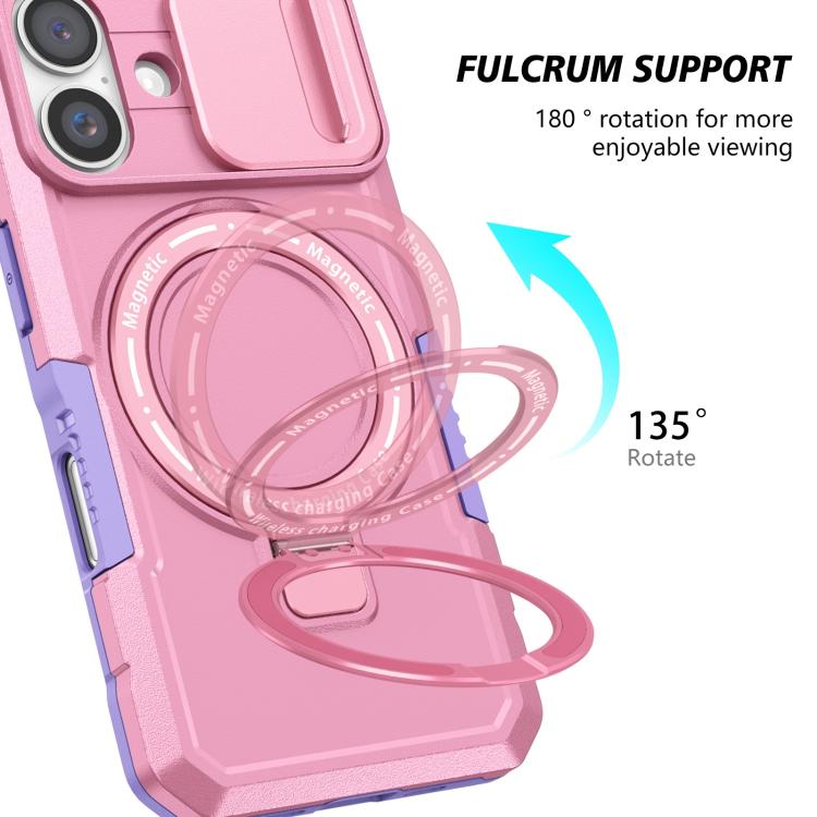 Funda híbrida TPU y PC con soporte Magsafe y protección deslizante para iPhone 16 Plus (Morado y Rosa)