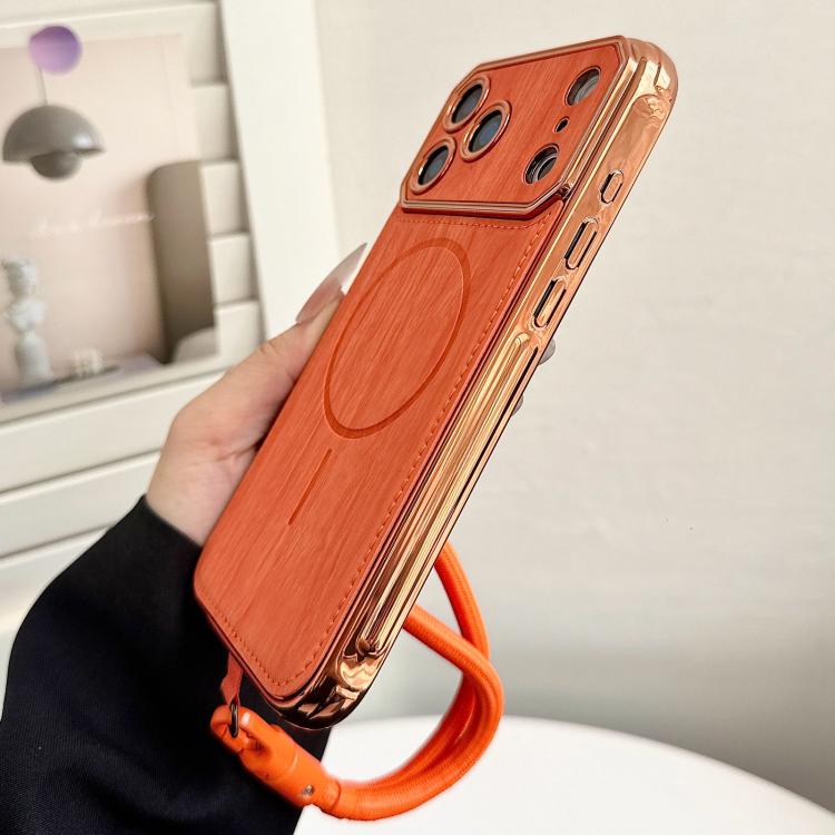 Funda MagSafe para iPhone 17 Pro Max con ventana grande de TPU galvanizado con textura de madera, con película para lente y correa (naranja)