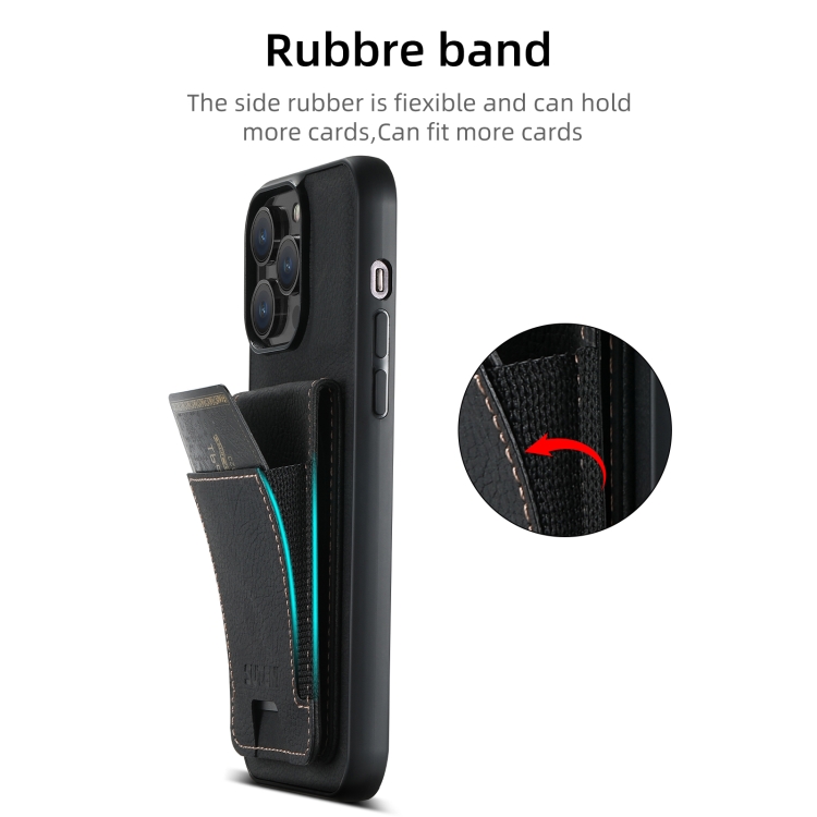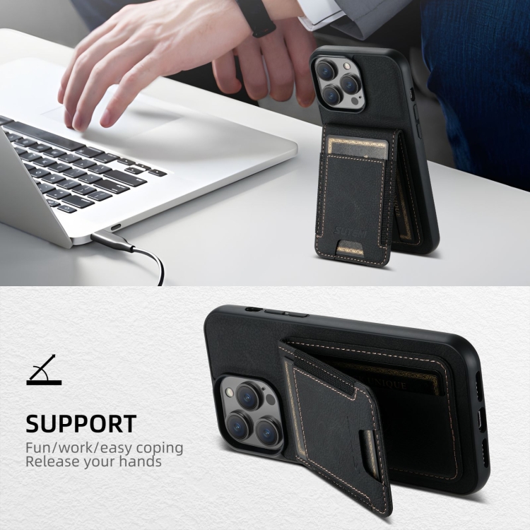 Funda para iPhone 16 Pro Suteni H03 Piel de Lichi con Tarjetero y Soporte (Negra)