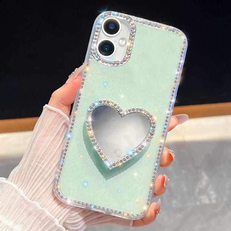 Funda para iPhone 17 con forma de corazón, con espejo y purpurina de diamante (verde claro)