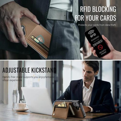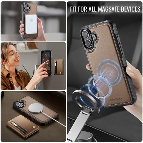 Funda para iPhone 17 JEEHOOD J12 con cremallera RFID MagSafe y tarjetero (marrón)