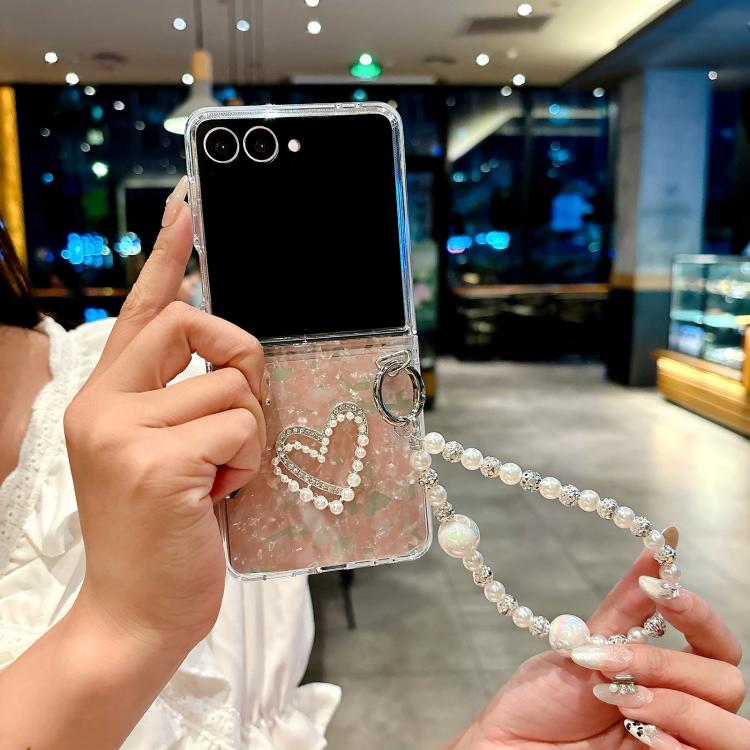 Funda para Samsung Galaxy Z Flip7 5G con textura perlada y patrón de corazón, con pulsera (rosa y verde)