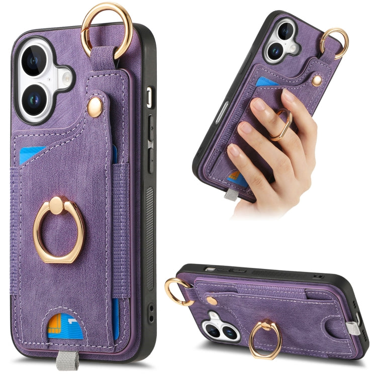 Funda para Teléfono iPhone 16 con Anillo y Tarjetero Estilo Retro con Asa para Colgar (Morado)