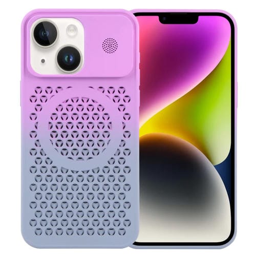 Funda para Teléfono iPhone 14 Aromaterapia y Enfriamiento Forma Panal (Morado y Gris)