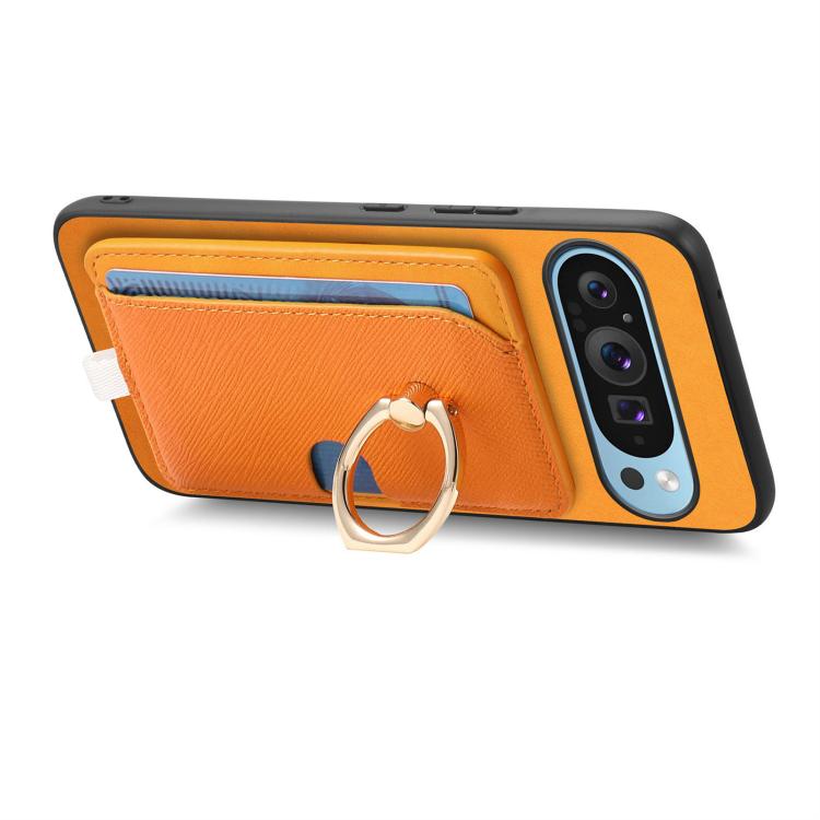 Funda para Teléfono Google Pixel 7A Magsafe con Ranuras para Tarjetas, Diseño Cruz de Cuero y Anillo Lateral (Amarillo)