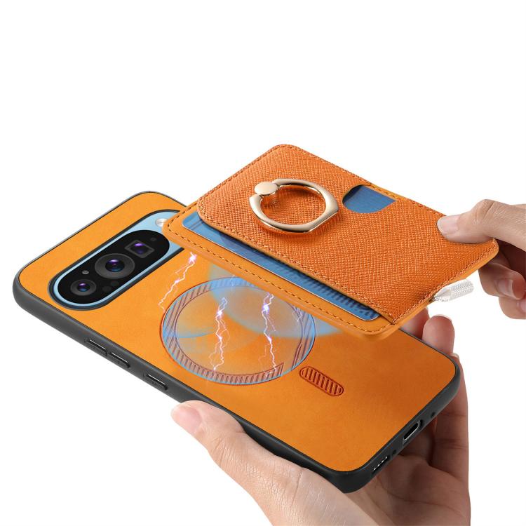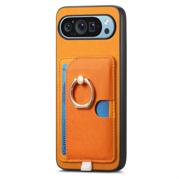 Funda para Google Pixel 9/9 Pro con Ranuras para Tarjetas, Diseño Retro Cruz, Cuero y Anillo Lateral (Amarillo)