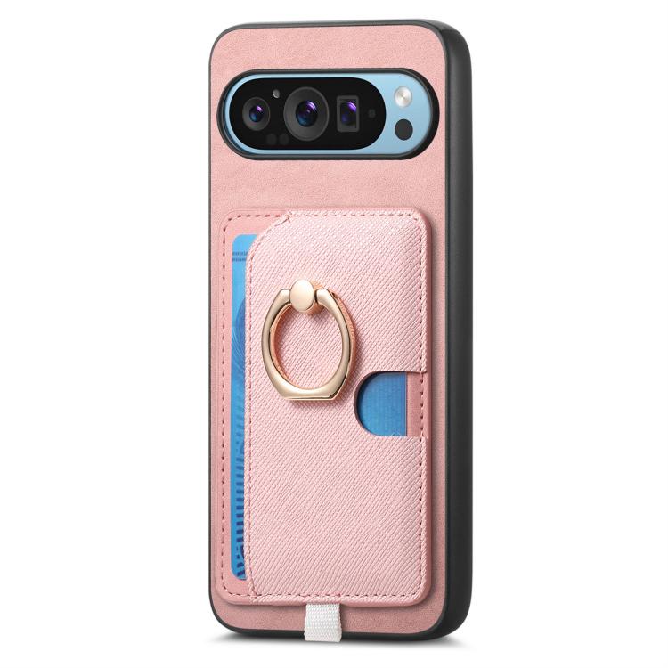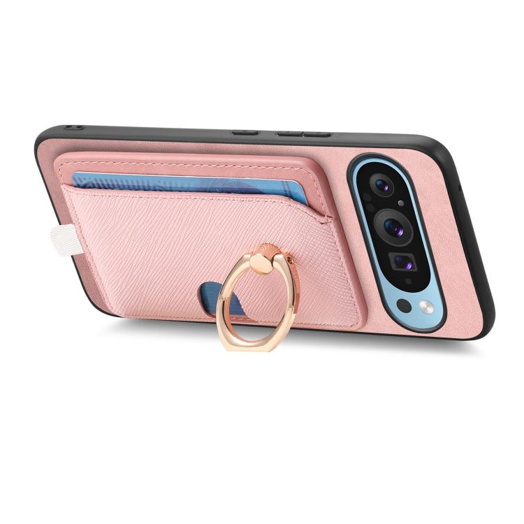 Funda para Google Pixel 9/9 Pro con Ranuras para Tarjetas, Diseño Retro Cruz de Cuero y Anillo Lateral (Rosa)