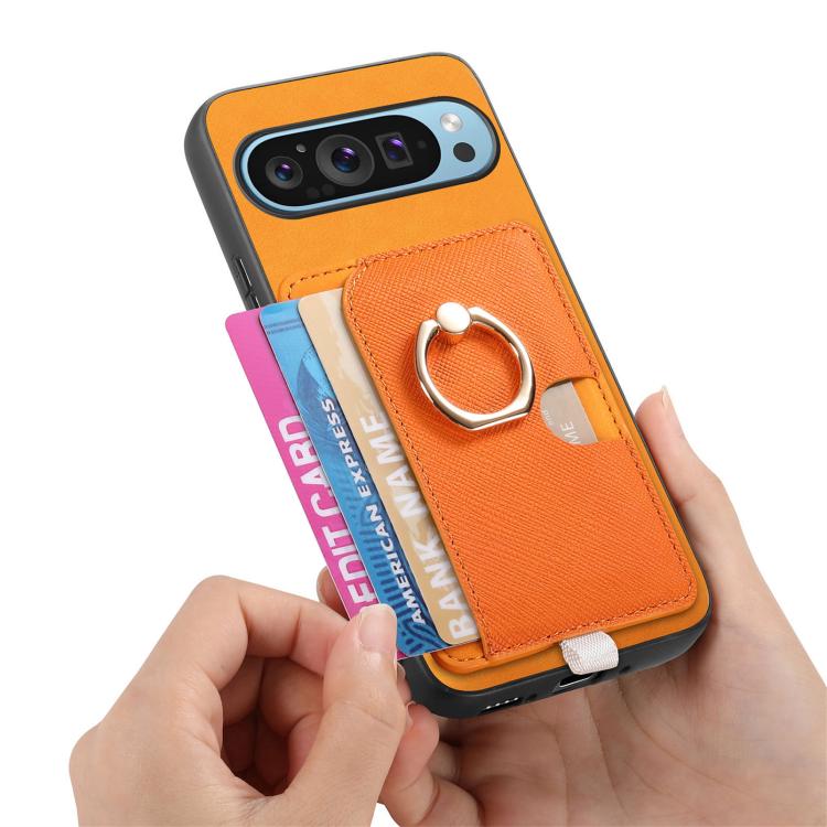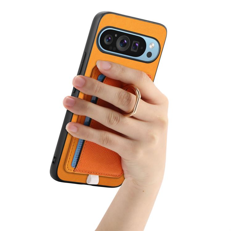 Funda para Google Pixel 9 Pro XL con Ranuras para Tarjetas, Diseño Retro Cruz y Anillo Lateral (Amarillo)