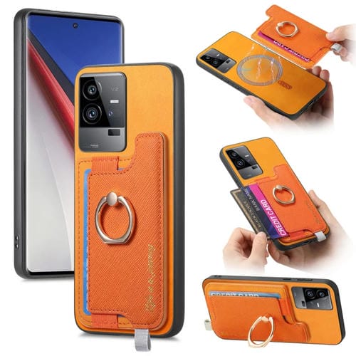 Funda para Teléfono con TaRJetero y Anillo de Cuero con Diseño Retro Magsafe Cross para Vivo Iqoo 11 Pro 5G (Amarillo)