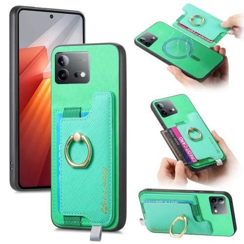 Funda para Teléfono con TaRJetero y Anillo de Cuero con Diseño Retro Magsafe Cross para Vivo Iqoo Neo8/Neo8 Pro (Verde)