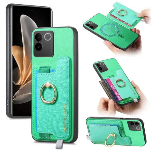 Funda para Teléfono con TaRJetero y Anillo de Cuero con Diseño Retro Magsafe Cross para Vivo S17E / Iqoo Z7 Pro / T2 Pro (Verde)