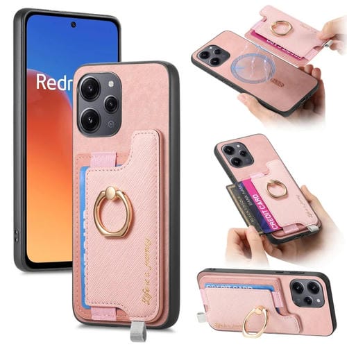 Funda para Teléfono con TaRJetero y Anillo de Cuero con Diseño Retro Magsafe para Redmi 12/Note 12R/Poco M6 Pro 5G (Rosa)