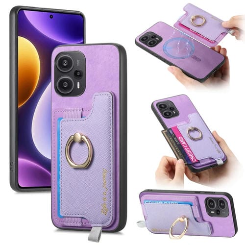 Funda para Teléfono con TaRJetero y Anillo de Cuero con Diseño Retro Magsafe para Redmi Note 12 Turbo/Poco F5 5G (Morado)