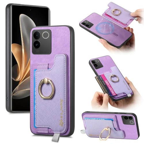 Funda para Teléfono con TaRJetero y Anillo de Cuero con Diseño Retro Magsafe para Vivo S17E / Iqoo Z7 Pro / T2 Pro (Morado)