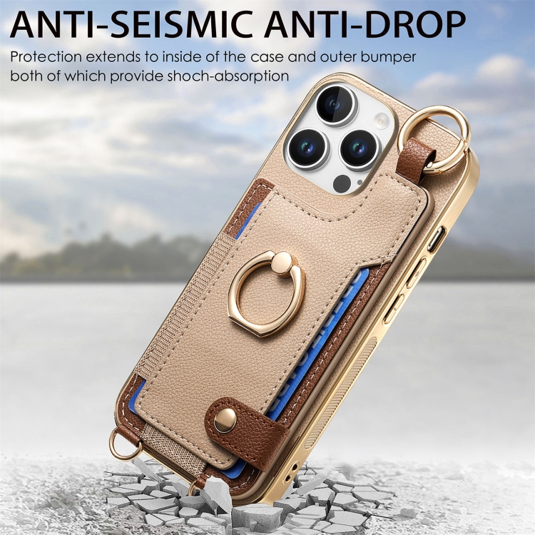 Funda para Teléfono iPhone 16 Pro con Tarjetero Anillo y Presilla para Colgar (Caqui)