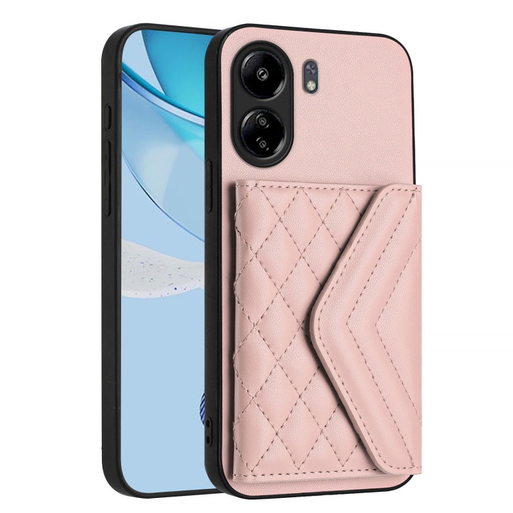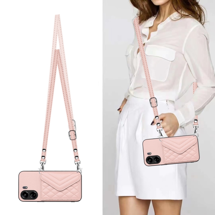 Funda para Teléfono con Textura Rómbica y TaRJetero Rfid para Xiaomi Poco C65 con Cordón Largo (Oro Rosa)