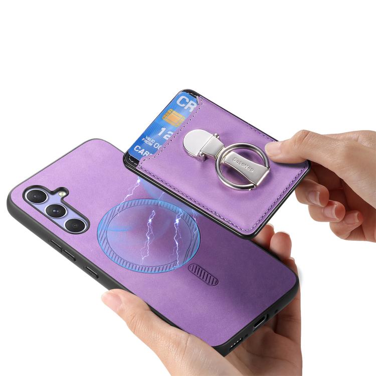 Funda retro plegable con anillo y tarjetero MagSafe para Samsung Galaxy A15 (morado)
