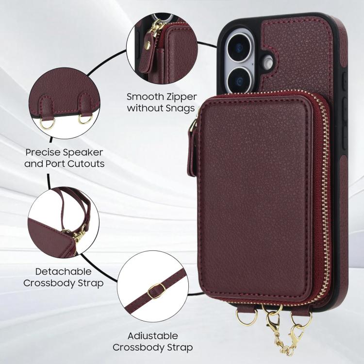 Funda tipo cartera bandolera con cremallera AwQuer 2 en 1 para iPhone 17, con parte trasera de cuero (rojo vino).