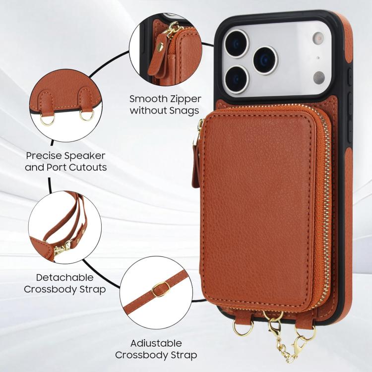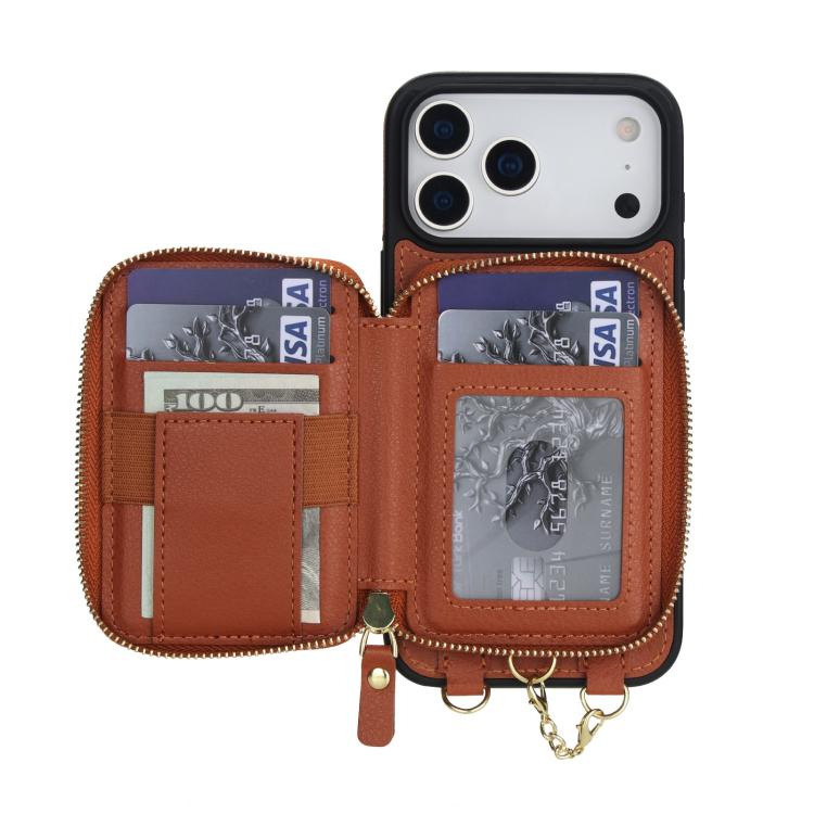 Funda tipo cartera bandolera con cremallera AwQuer 2 en 1 para iPhone 17 Pro con parte trasera de cuero (marrón)