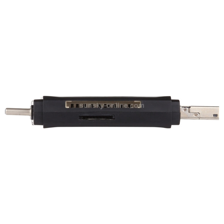 El Lector de Tarjetas USB-C Type-C + SD + TF + Micro USB a USB 2.0 en color Negro es un dispositivo multifuncional diseñado para facilitar la transferencia de datos entre diferentes tipos de Tarjetas de memoria y Puertos USB. Compatible con sistemas operativos Windows, Mac OS y Android, este Lector permite la Conexión simultánea a Puertos USB 2.0, Type-C y Micro USB, ofreciendo versatilidad para usuarios que requieren un acceso rápido y eficiente a Tarjetas Micro SD (TF) y SD. Su construcción combina materiales de PC y Metal, garantizando durabilidad y un diseño compacto con dimensiones de 7.5x2.2x1.1 cm, ideal para uso profesional o personal.