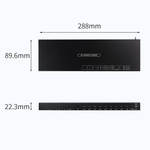 - Resolución soportada: 4K 30Hz, 1080P 60Hz, 720P 60Hz; Entrada HDMI x9; Salida HDMI x1; Ancho de Banda 60Hz; Fuente de Alimentación CC 12V 2A; Temperatura de trabajo -50 a 80 °C; Dimensiones 288x89.6x22.3 mm; Peso 0.67 kg