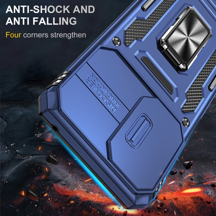 - Protección de Cámara con Cubierta deslizable, Bolsas de aire en las cuatro esquinas para absorción de impactos, Soporte magnético para autoMóvil, anillo metálico giratorio 360°, acabado microcepillado para mejor agarre