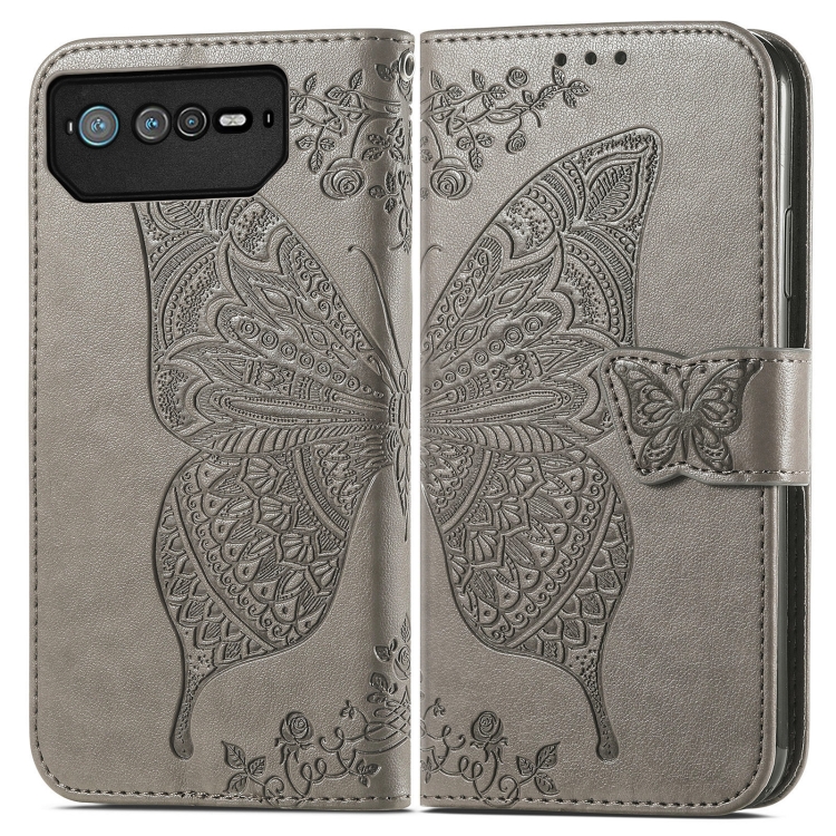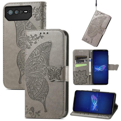 Funda de Cuero para Asus Rog Phone 6 Butterfly Love Flower con Tapa en Relieve (Gris)