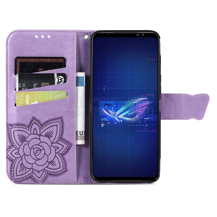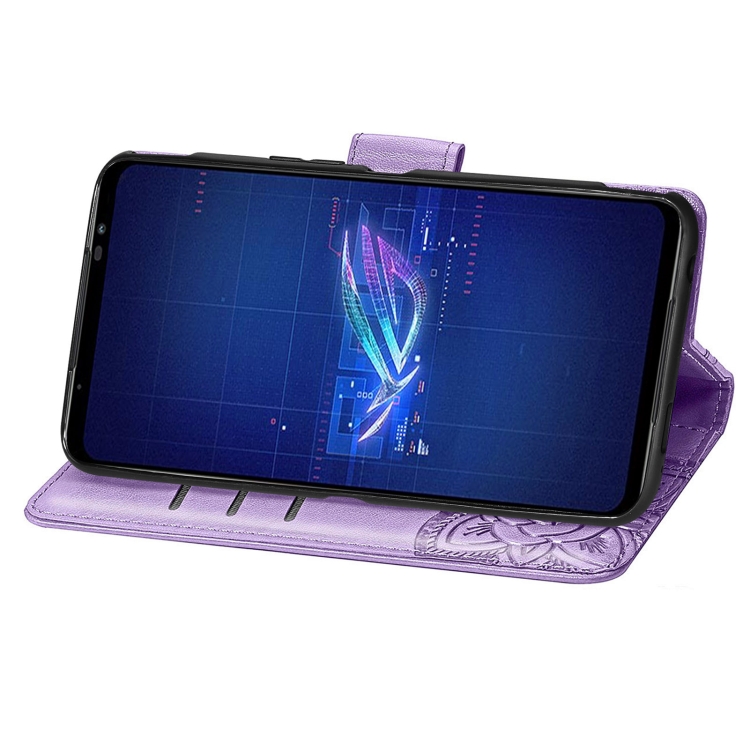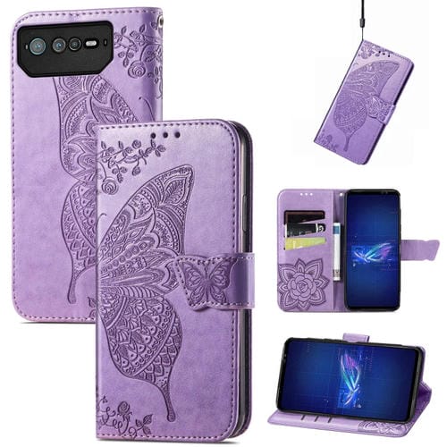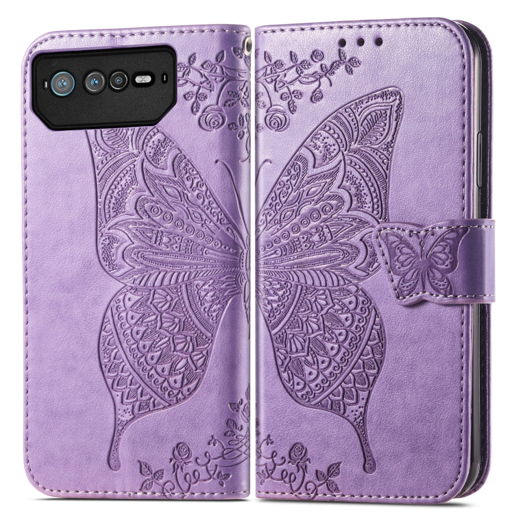 Funda de Cuero para Asus Rog Phone 6 Butterfly Love Flower con Tapa en Relieve (Púrpura Claro)