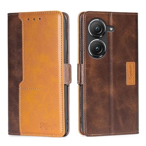 Funda de Cuero para Asus Zenfone 9 con Hebilla Lateral y Contraste (Marrón Oscuro + Dorado)