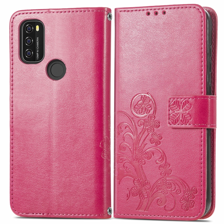Funda de Cuero para BlackView A70 con Cierre de Cuatro Hojas, Hebilla, Ranura para Tarjeta y Soporte (Magenta)