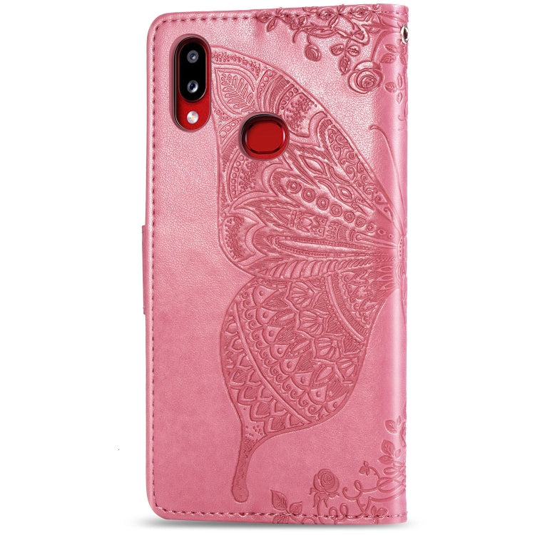 Estuche de Cuero Galaxy A10S Butterfly Love Flowers con Tapa Horizontal, Soporte, Ranuras para Tarjetas, Billetera y Cordón (Rosa)