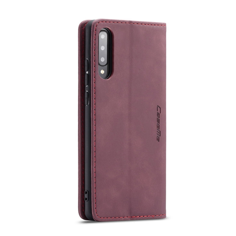 Estuche de Cuero Caseme-013 para Galaxy A70S con Tapa Horizontal Multifuncional, Ranura para Tarjeta, Soporte y Billetera (Rojo Vino)