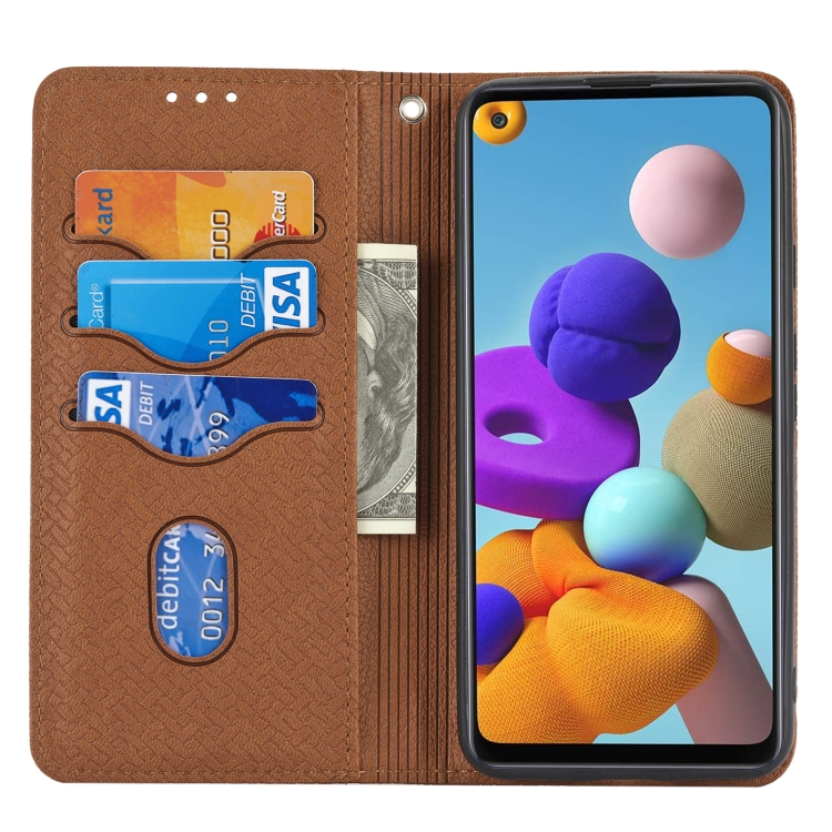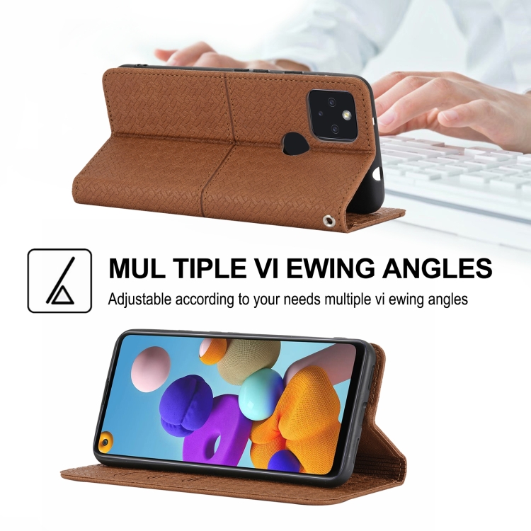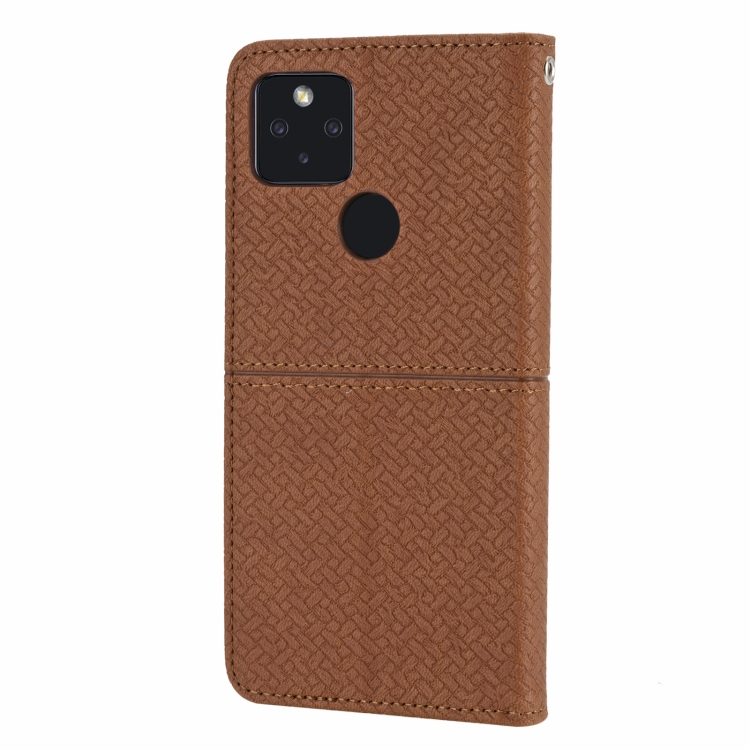 Para Google Pixel 5a 5g Textura tejida costura magnética Horizontal Flip PU Funda de cuero con soporte y ranuras para tarjetas y cordón (marrón)
