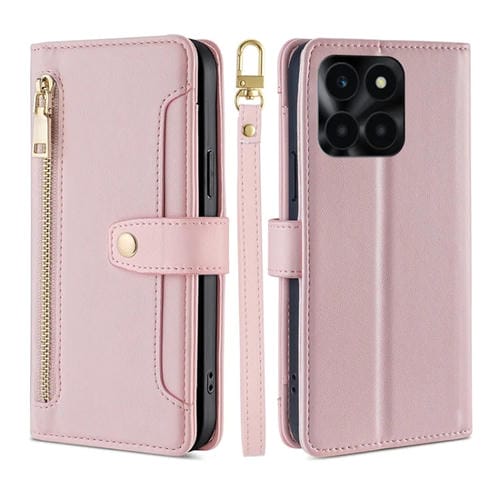 Funda de Cuero para Honor X6A 4G Lite con Billetera, Cremallera y Textura de Oveja (Rosa)
