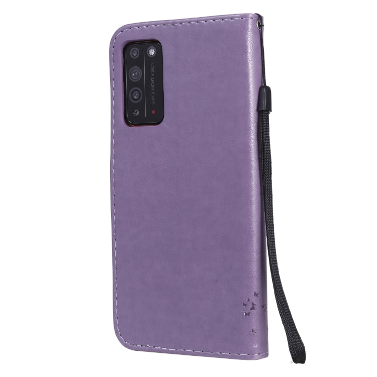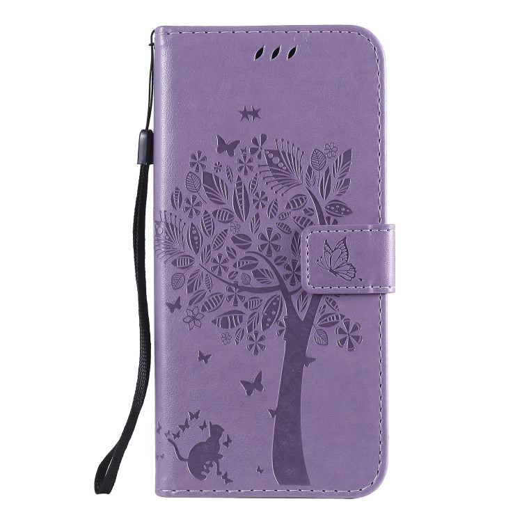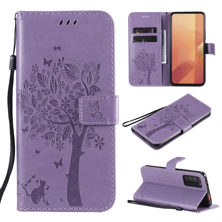 Funda de Cuero Huawei Honor X10 5G con Árbol y Gato en Relieve, Tapa Horizontal, Soporte, Ranuras, Billetera y Cordón (Morado Claro)
