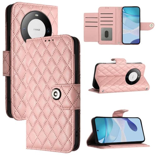 Funda para Huawei Mate 60 Pro y 60 Pro+ con Tapa de Cuero Textura Rómbica y Cordón (Rosa Coral)