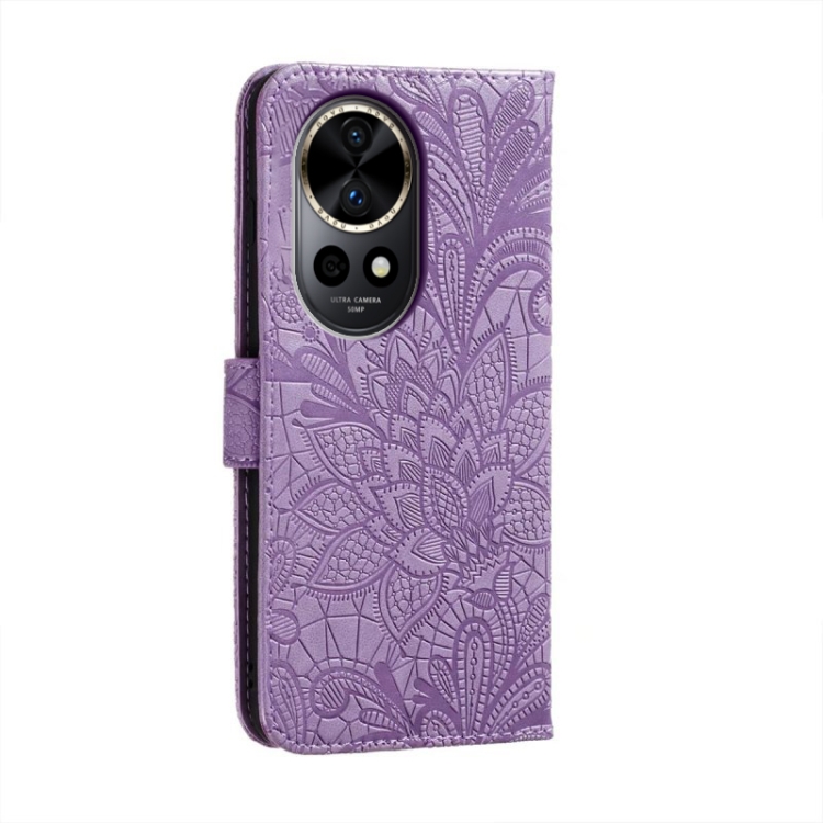Funda de Cuero para Huawei Nova 12 Pro con Tapa y Estampado de Flores de Encaje (Púrpura)