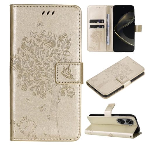 Funda para Huawei Nova 12 Se y Nova 11 Se de Cuero con Tapa y Patrón En Relieve Árbol y Gato (Dorado)