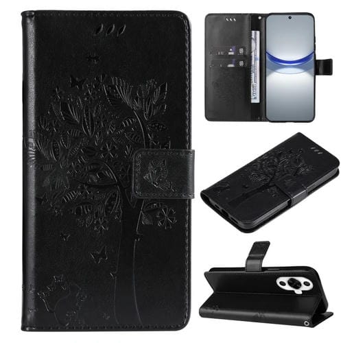 Funda para Huawei Nova 12S de Cuero con Tapa y Patrón en Relieve Árbol y Gato (Negro)