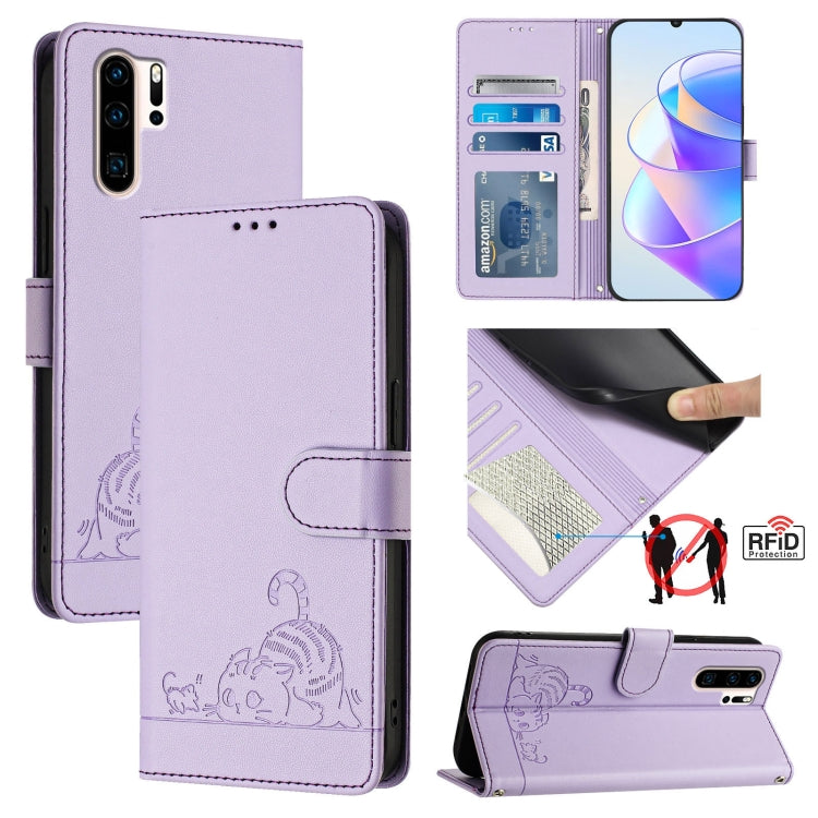 Funda para Huawei P30 Pro de Cuero Rfid con Patrón en Relieve y Cordón (Púrpura)